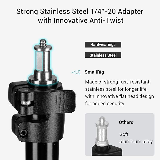 - Multiple Usage Scenarios: It comes with a stainless steel 1/4" thread adapter, more reliable compared to aluminium alloy material. It is highly compatible with DSLRs, LED video lights, ring lights, reflectors, softboxes, and other devices. The plane cutting brings more secure accessory connection.