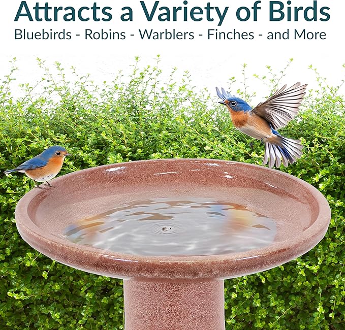 - STRONG AND STURDY: This outdoor bird bath is made from durable ceramic with a mineral glaze finish for long-lasting beauty. This bird bath is resistant to weather, UV rays, and frost. Please note, variations in color may occur due to manual glazing and the unique kiln process.