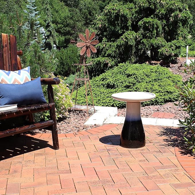 - STYLISH OUTDOOR ACCENT: This ceramic glazed bird bath for outdoors can be placed on the patio, in the yard, or in the garden for a beautiful outdoor accent. It features a wide, shallow bowl which makes it easy for a variety of birds to preen and bathe.