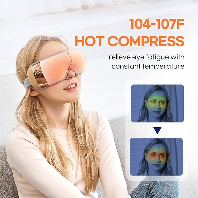 - 【Comfortable Heating Massage】HubiCare eye massager built-in heating pads provide a comfortable temperature between 104 and 107 degrees Fahrenheit(40℃-42℃), better for relaxing eye puffiness, dry eyes, etc. A hot compress can regulate the metabolism of the eyes, more effectively improve symptoms such as dry eyes, and reduce dark circles. Note 1: We do not recommend customers use eye machines if they have undergone eye operation, retina condition, cataract, glaucoma, etc.