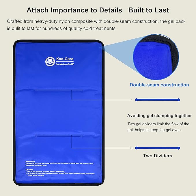 - Flexible and Long-lasting Back Ice Pack. Sealed in premium gel with Koo-Care unique formula, this gel ice pack remains pliable after frozen even at -4°F (-20℃), easy to morph into the shape fits the specific body parts. In addition, the gel pack was filled with enough 3.5 lbs of high-performance gel, it can absorb more energy in the freezer, thus can deliver up to 30 minutes of pain relief. Compared to some 20-minute brands, this ice pack has clear advantage.