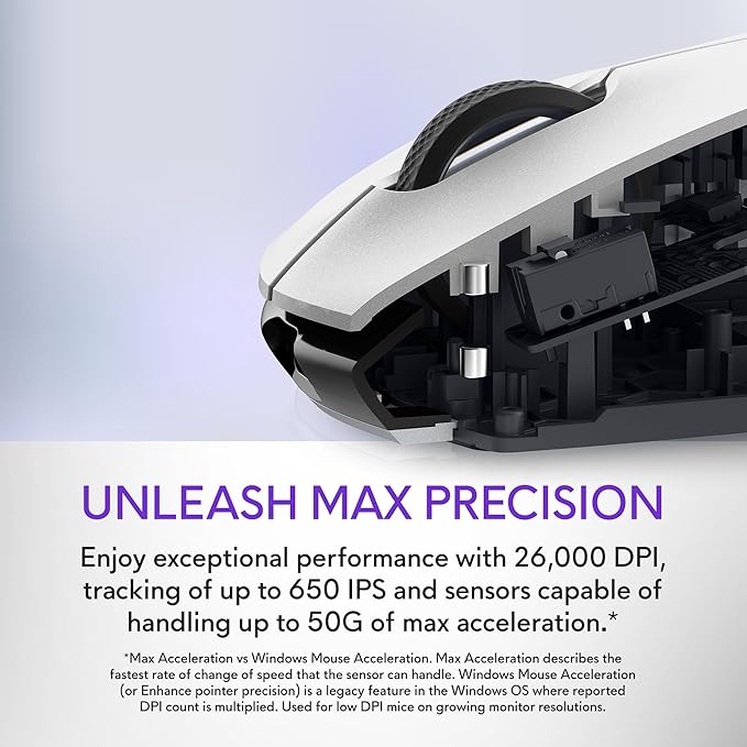 - Unleash max precision: Enjoy exceptional performance with 26,000 DPI, tracking of up to 650 IPS and sensors capable of handling up to 50G of max acceleration.