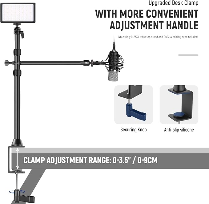 - 【What’s Included】NEEWER tabletop mount stand, holding arm, and manual. Note: When the holding arm is attached, to adjust stand height, please loosen the holding arm’s tightening knob first; the arm can not be clamped to the top section of the stand