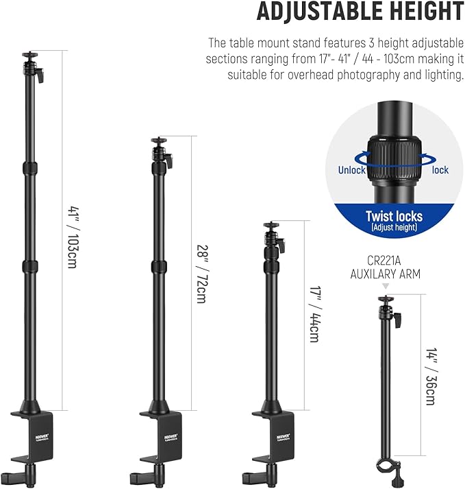 NEEWER Camera Desk Mount with Overhead C Amera Mounting Arm and 1/4" Ball Head, 17" - 41" Adjustable Tabletop Light Stand with C Clamp for DSLR Camera, Ring Light, Webcam, Photo Video Shooting
