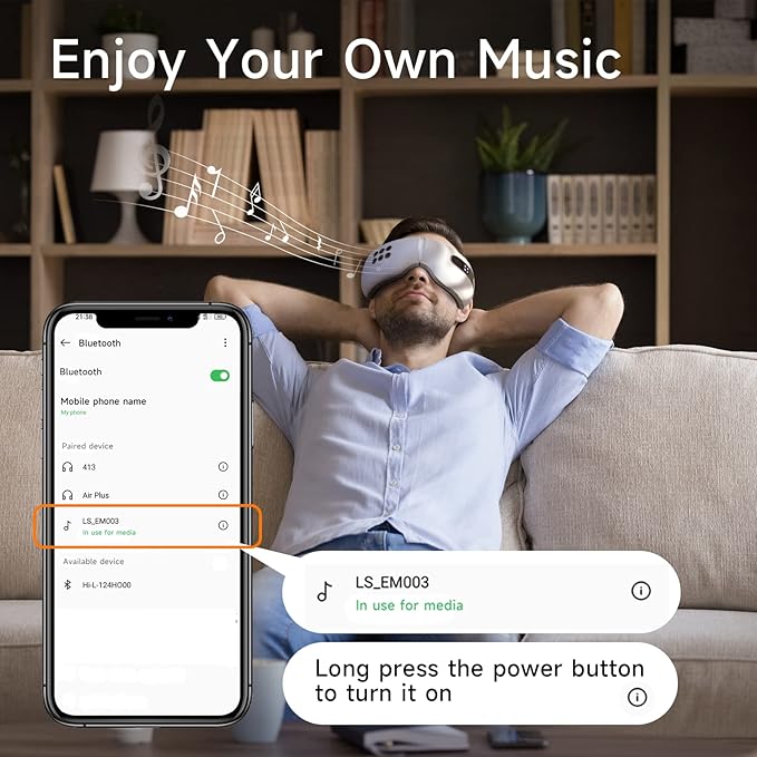 - đ”ăErgonomic Design with Musică The heat cooling bluetooth smart eye massager adopting groove design to care for eyeballs, dry eyes, the electric heated eye massager uses a combination of massage techniques with soothing music, relaxed air pressure, skin-friendly leather material and adjustable headband, fits most faces and comfortable to wear.
