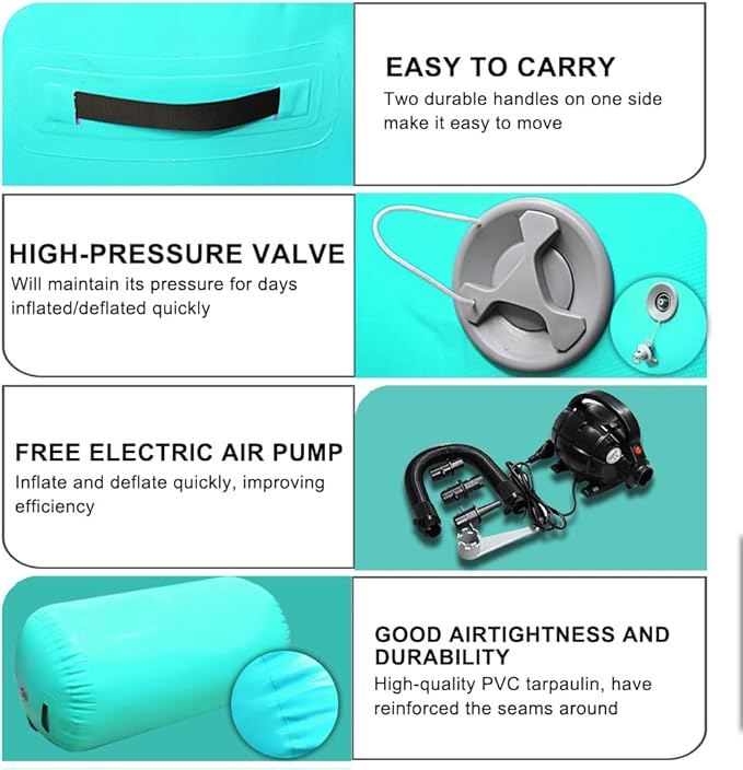 - Portable Inflatable Gymnastics Equipment With Electric Pump : Our air roller gymnastics tumbling barrel is lightweight and comes with free electrical pump, can only take less than 3 minutes to inflate or deflate. After inflation, no noise during training and will maintain its pressure for days. After deflation, it can be rolled into a small size, easy to carry and store, you can put it in a portable carrying bag or in the trunk of the car.