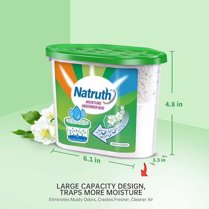 - 【EFFECTIVE ABSORBING】NATRUTH Absorb odors with jasmine and use Spherical calcium chloride to enlarge the area to absorb quickly. It can protect your belongings against dampness, rust and odor. 12.5OZ/pack large capacity moisture absorption keep dry for a long time.