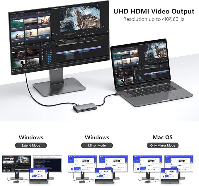 - Dual 4k Resolution Output: HDMI1/DP max up to 4K@60Hz, HDMI2 up to 4K@30Hz(work separately while source is DP1.4). When dual displays, HDMI1 or DP will be 4K@60Hz and HDMI2 up to 4K@59Hz(DP1.4). When using 2 hdmi+DP, HDMI1 up to 4K@59Hz, DP up to 4K@29Hz, HDMI2 up to 2K@60Hz(DP1.4).Display output will be 1080P when multiple monitor with VGA. Note!!! When using daul hdmi+DP, must follow the sequence or it will fail: Plug in HDMI1→Plug in DP(wait for the screen to display successfully)→Plug in HDMI2