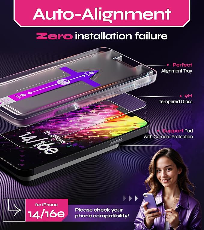 - 9H Nearly Diamond-Like Hardness Screen Protector for iPhone 14 & iPhone 16e to Completely avoid Shattering, Cracking and Scratches. The High-Quality Oleophobic Coating keeps your Screen Fingerprint-Free, Air Bubble-Free and Dust-Free