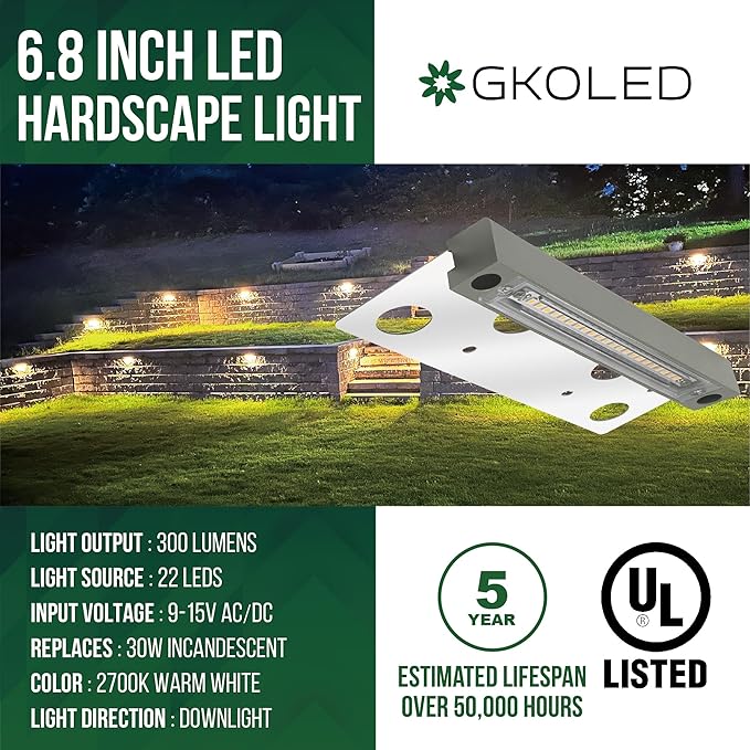 GKOLED 20-Pack 6.8 Inches Low Voltage Hardscape Light, 12V AC/DC Retaining Wall Lighting, 4W 2700K Paver Wall Lights, Outdoor Step Lights, Die-cast Aluminum Housing, Gray, UL Listed