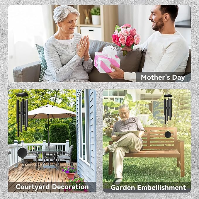 - Classical Garden Deocration: Black Wind Chime's overall style is clean, modern, simple, and elegant, whether you put it indoors or outdoors, it can be a perfect blend with your environment, and enhance your outdoor atmosphere. It has a large 'S' Hook, you can easily hang it in your garden, patio, balcony, porch, yard, tree, or any other outdoor location, even on a pole