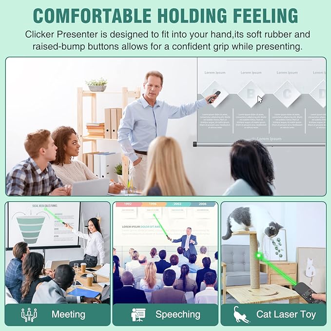 Presentation Clicker Green Laser Pointer with Air Mouse Function, Wireless Presenter Clicker RF 2.4GHz USB Presenter Control PowerPoint Presentation Clicker for Mac, Laptop, Computer
