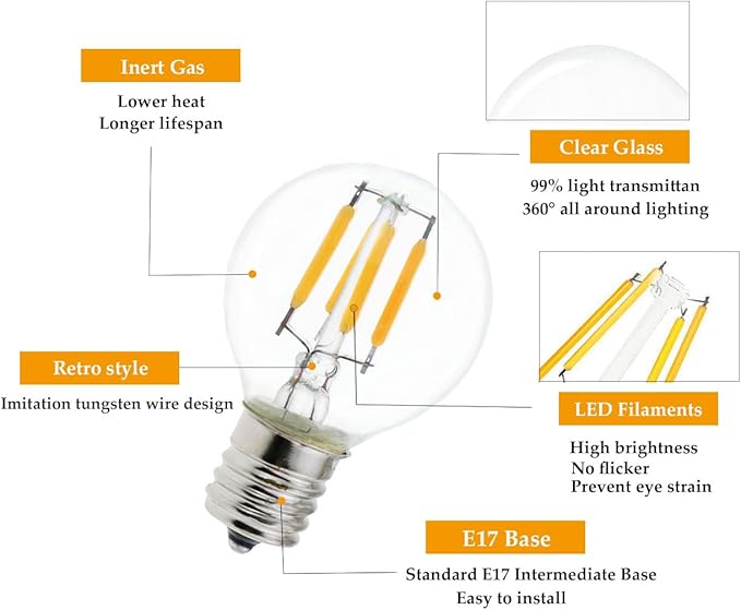 - 【Technical Features】 Bulb Size: 1.57"/40mm (Diameter) x 2.38"/60.5mm (Length), E17 Intermediate Base, Non-Dimmable, AC 110V-130V, 400 Lumens, Warm White 2700K, High CRI 80+, 360 degrees Beam Angle.