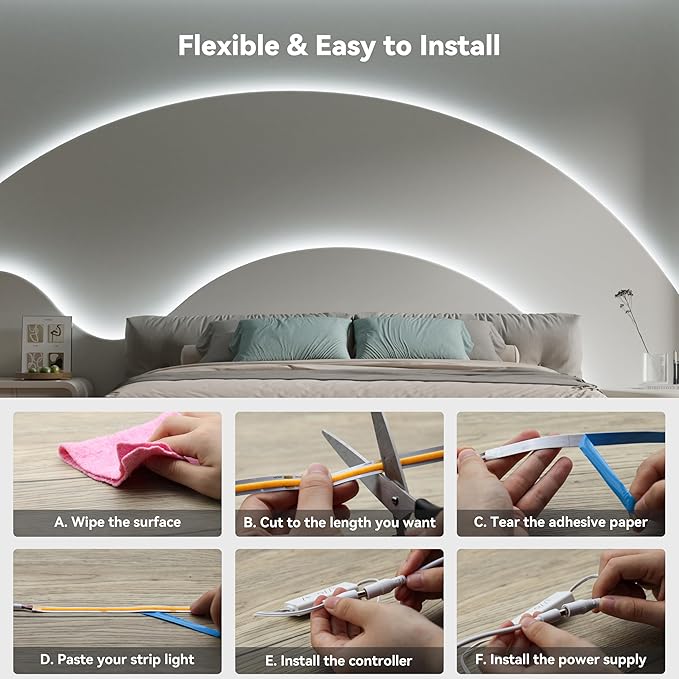 - 【Flexible, Easy to DIY】Cutting can be done every 50mm/1.97in along the middle of the copper sheet metal. The cut strip lights can be reconnected by using PAUTIX 8mm connectors or soldering (connectors sold separately). The ultra-thin PCB board close to 1.3mm/0.05in makes the COB strip light very flexible. You can bend it and even DIY more shapes. Super sticky double-sided adhesive backing tape makes installation more firm!
