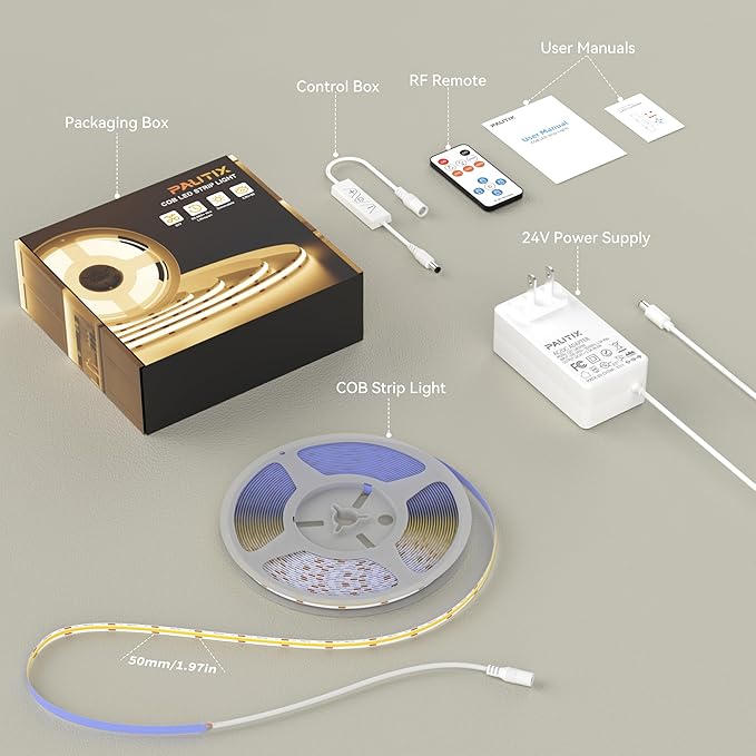 - 【Packaging and After-sales】The package contains: 1 X 16.4ft/5m PAUTIX 24V COB LED strip light 6000K daylight white; 1 X RF remote/controller; 1 X DC24V 2A 48W power supply; 1 × user manual. PAUTIX provides a 6-year warranty service for each customer. Please contact PAUTIX promptly if you encounter any issues while using the product and PAUTIX will provide you with professional guidance and satisfactory solutions!