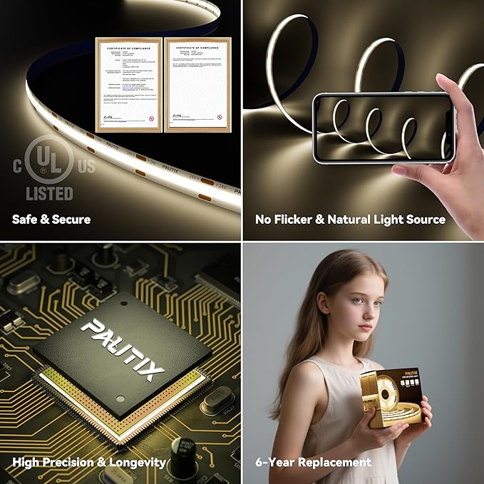 - 【Lead-free Materials & UL Listed】Designed with lead-free materials, PAUTIX COB LED strip lights are more environmentally friendly and protect your health than others. 24V low voltage no longer worry about electric shock, safer to use; low power consumption, energy saving. UL Listed, the quality is more trustworthy!