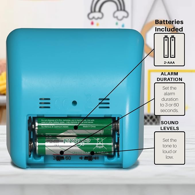 - Easy To Use -- Turn the dial clockwise to adjust the time. To turn the timer off—simply turn back to zero. Requires 2 "AAA" batteries (Included). Set the tone to loud or low, and the alarm time to 3 or 60 seconds. No distracting ticking beep sound.