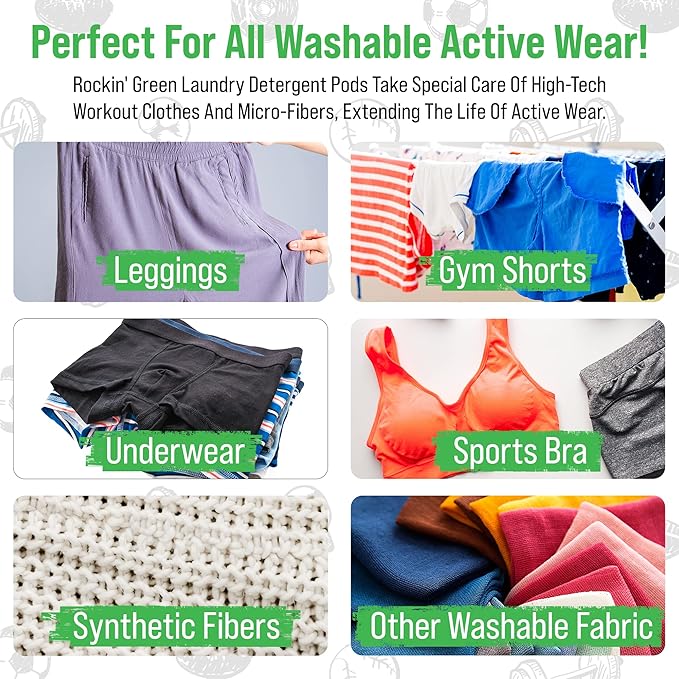 Rockin' Green Laundry Detergent Pods, Plant-based, All Natural, Vegan & Biodegradable Odor Fighter, Safe for Sensitive Skin (Unscented, Active Wear 40 Pods)