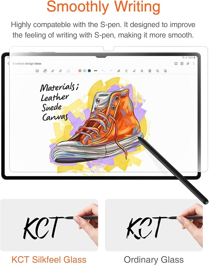 - Nano-Texture Surface: Designed for Samsung tablets, using the latest Japanese etching technology. Enhance the touch of the surface, when you touch the screen protector with your hand, it gives you a smooth and soft feeling like silk, which makes you fall in love with the feel. Feels dry and not sticky. When you use with S-pen, the response is sensitive and not delayed, and the nib writes smoothly and does not slip. Follow the pace of your inspiration