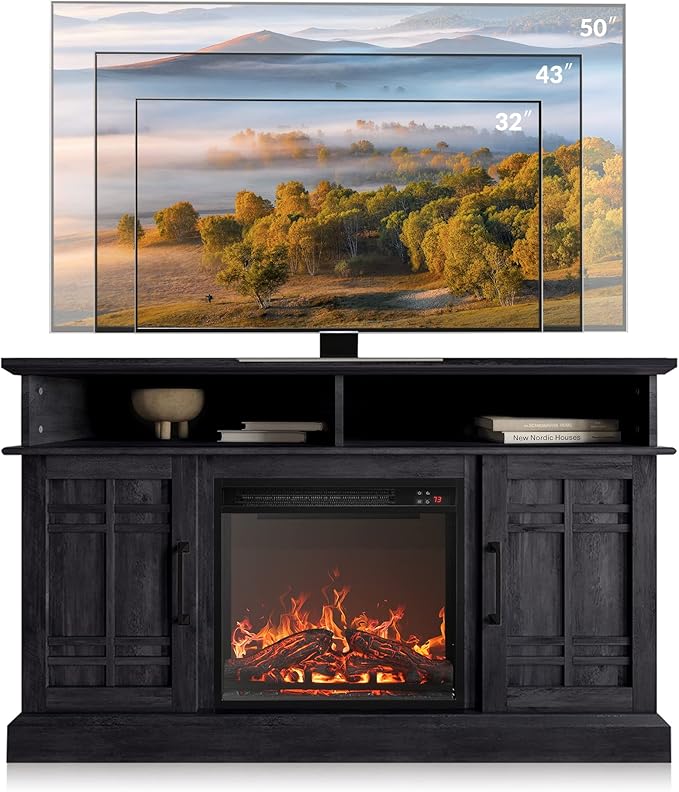 - [FIREPLACE TV STAND] Our console cabinet includes an 18" electric fireplace so you can enjoy cozy warmth without the smoke and ash. The 120 V, 1400 W fireplace can warm up spaces up to 400 square feet and measures 18"L x 5.07"W x 17.17"H.