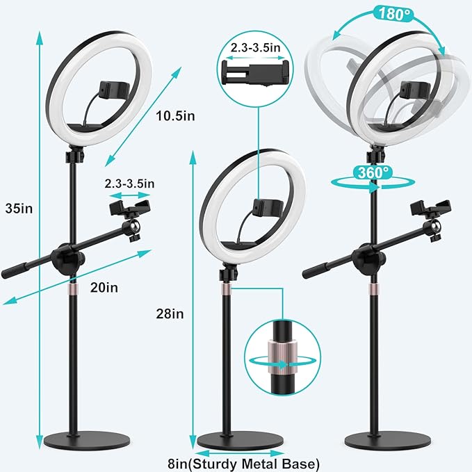 - Adjustable Overhead Phone Mount: Most ring lights cannot take close-up shots. Vlogging ring light with overhead camera mount helps you film at almost any angle. The phone holder, arm ball joint, and arm are flexible. You can adjust the arm angle, height and length as your wish to meet your different filming scenarios like top-down video recording, live streaming, baking, cooking, crafting, drawing, nail art, tattoo, etc.