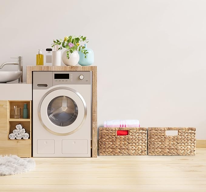 Large 14.5” x 13.5” x 8” (Set of 3) Natural Water Hyacinth Woven Storage Baskets, Rectangular Wicker Basket with Built-in Handles, Large (Natural)