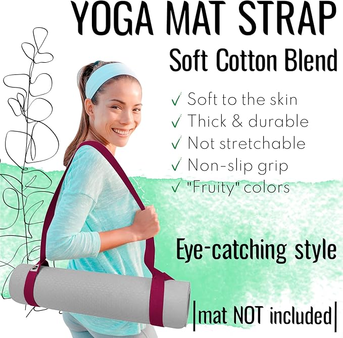 - YOGA MAT STRAP: Color: DEEP RASPBERRY. Length: 64 IN. Material: Cotton Blend (polycotton). Skin-friendly. Non-slip grip. [MAT NOT INCLUDED]