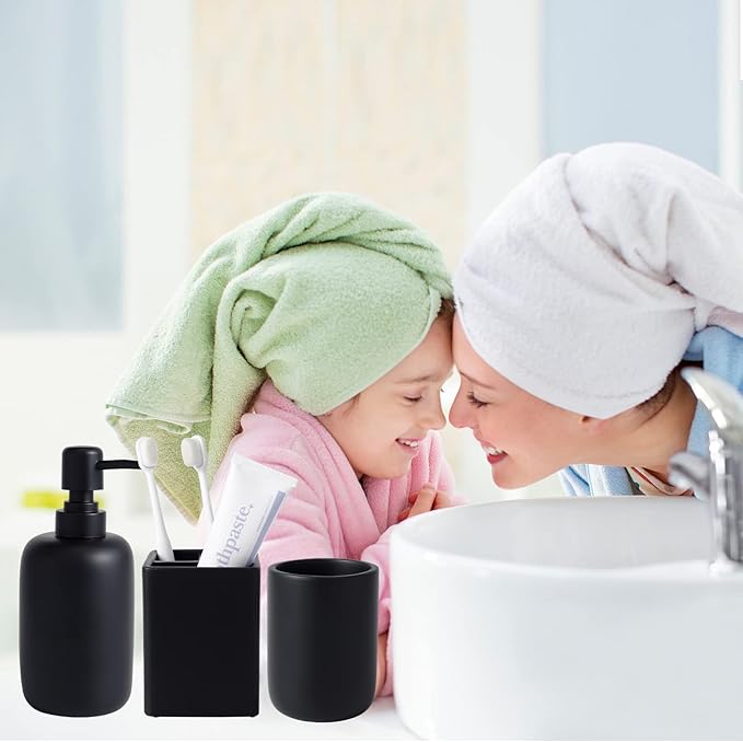 - RESIN BLACK BLACK BATHROOM ACCESSORIES SET COMPLETE - Our bathroom set includes 1x soap dispenser, 1x canister, 1x toothbrush cup, 1x self draining soap dish and 1x tumbler. A complete set of all-in-one bathroom essentials that are easily accessible!
