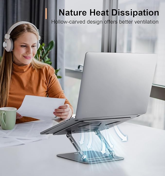 - Ventilation and Cooling: Aoviho laptop stand is made of high-quality aluminum, it can absorb and discharge heat easily. Using a laptop riser will increase the airflow underneath your laptop thus helping to keep it cool, preventing the risk of damage, and ensuring its longevity for long term use.