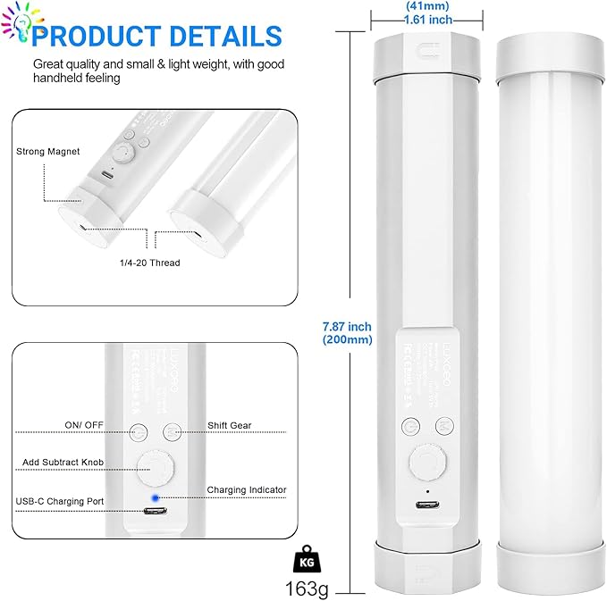 LUXCEO Handheld Light Wand, Multicolor RGB LED Video Light for Photography, 2000mAh Rechargeable Mini Light Stick for Video Shooting Professional Tube Lights with Magnetic for Vlog, TikTok(White)