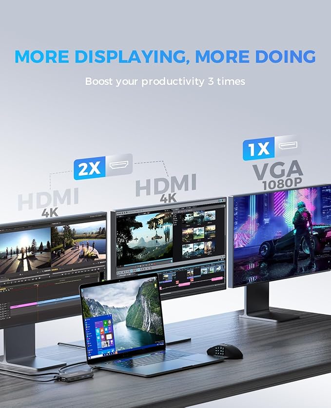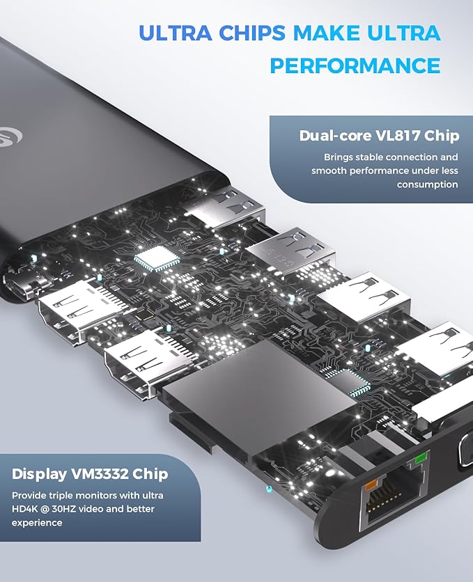 - 【Triple Monitors Display Flexibility】UtechSmart conquers this technical hurdle to create the first USB C docking station with triple display capability on the market. the UtechSmart docking station supports single and dual HDMI monitors up to 3840x2160@30Hz or triple monitors up to 1920x1080@60Hz. Three monitors modes Boost your efficiency 3 times. Note: It does not support extend mode for macOS.