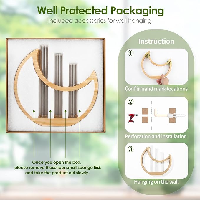 - NO ASSEMBLY REQUIRED: This crescent moon test tube planter does not require any assembly, it is ready to put on a table or windowsill. In case if you want to hang on the wall, we included two optional special J shaped screw hook and anchor for you, easily put two screw hooks into the wall and slide on. The test tube is removable for refill with water or clean.
