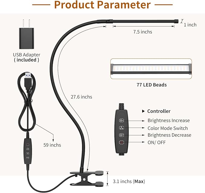 - 【WHAT YOU'LL GET】: 1x Book Light with Clamp, 1x USB Power Adapter (5V/2A), 1x User Manual, 1x 24-months-warranty.