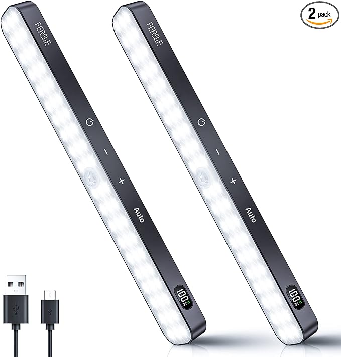 Ferswe Under Cabinet Lights Rechargeable, Battery Level Display, 60 LED Motion Sensor Cabinet Light, Dimmable Touch Control, Under Counter Lights for Kitchen, Closet, Cupboard(2 Pack)