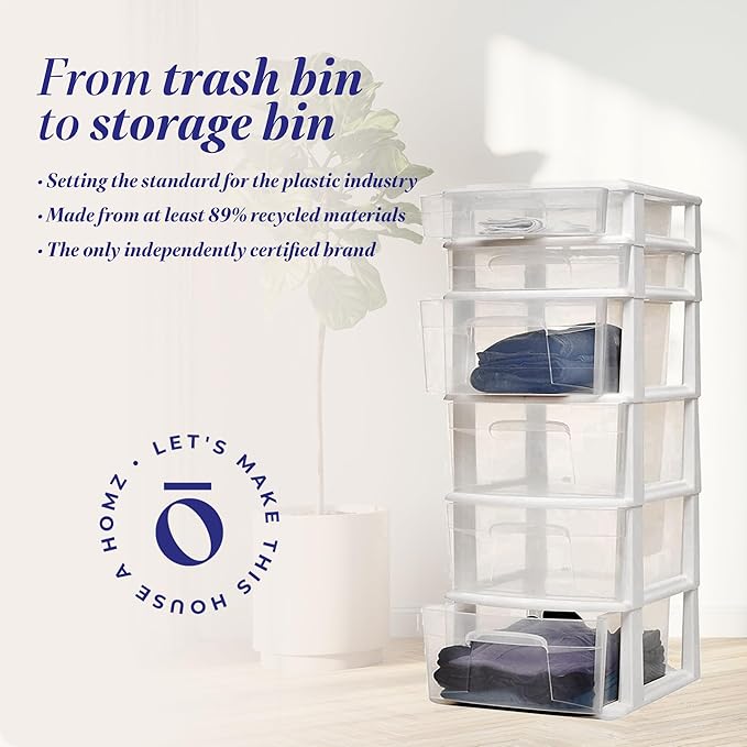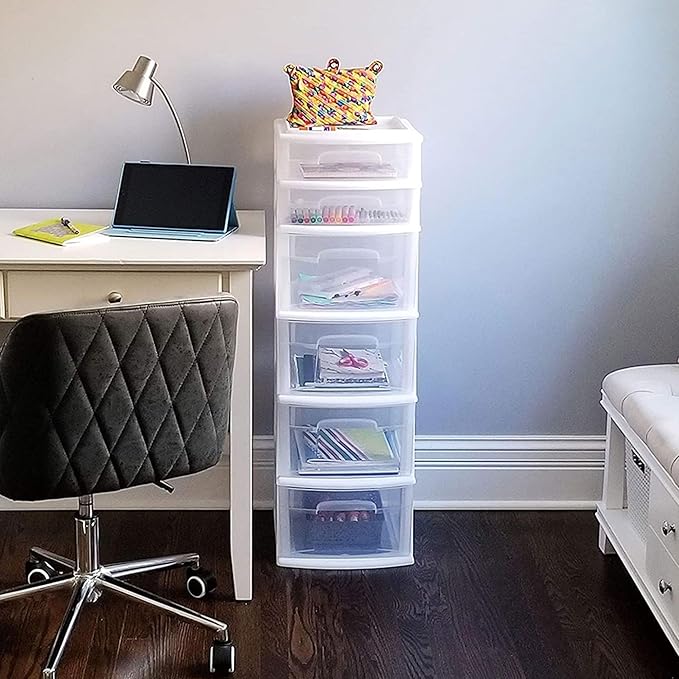 - Clear plastic design with easy-access handles makes it easy to see storage contents without having to open or remove drawers