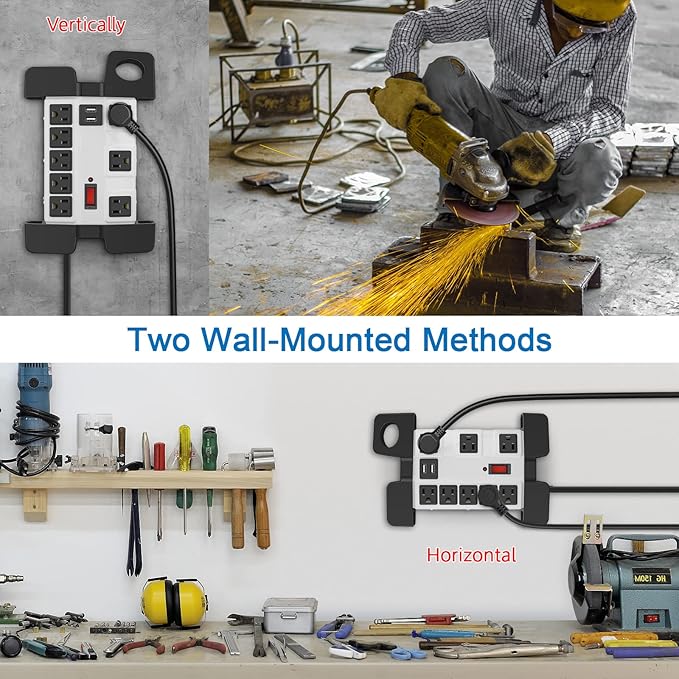 - Workshop 8 outlets power strip surge protector 2700J enough for larger surges, with 15FT 14AWG/3C power cord. The cord wrap velcro design for organize cable.