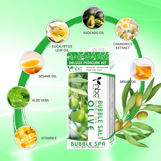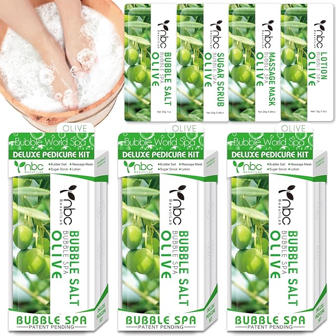 Pedicure Kit Foot Soak Set: Bubble Salt, Sugar Scrub, Massage Mask, Massage Lotion in a Box, 4 Step Foot Spa Kit for Dry Feet, Calluses and Tired Feet(3 Set Olive)