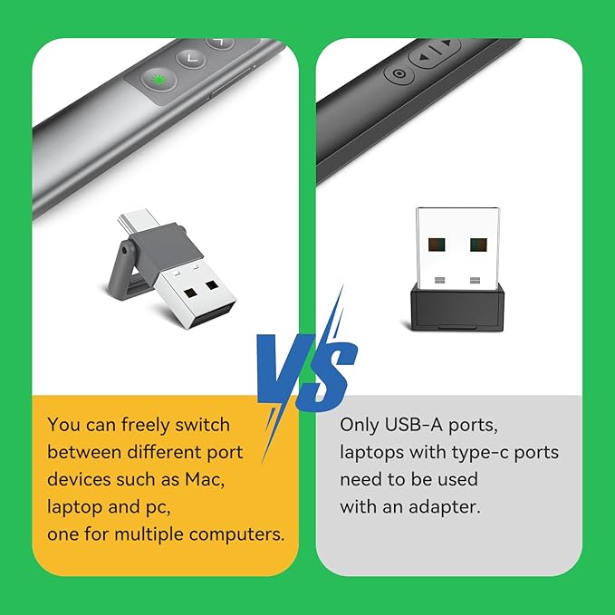 - ✔️Plug&Play: Our wireless presenter features a versatile 2-in-1 USB C/USB A receiver, offering seamless plug-and-play compatibility with both MacBooks and traditional PCs. No need to download any software or drivers; plug in and get started.