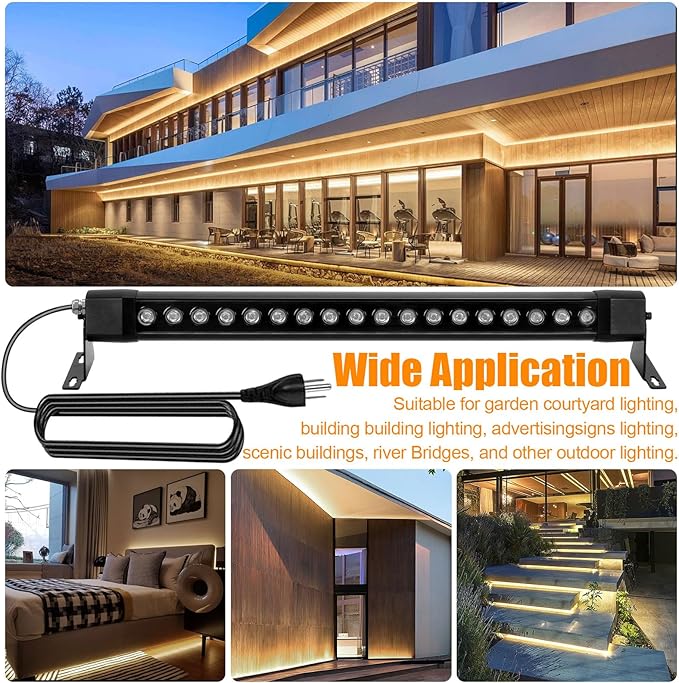 - ใ๐ ๐๐ฌ๐ญ ๐๐ง๐ ๐๐ข๐ฆ๐ฉ๐ฅ๐ ๐๐ง๐ฌ๐ญ๐๐ฅ๐ฅ๐๐ญ๐ข๐จ๐งใ: The 120V LED wall washer light strip is equipped with a 5-foot outdoor waterproof power cord and an American three prong plug, which is convenient for use without wiring. The 150 ยฐ adjustable mounting bracket of the LED light bar can be positioned or suspended in any angle and various scenes you like.
