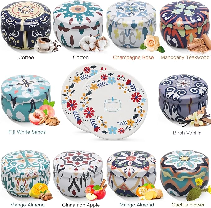 - Scented Candles Gift Set - Contains 10 Scents: Fiji White Sands, Coffee, Cinnamon Apple, Champagne Rose,Mango Almond, Marshmallow Fireside, Mahogany Teakwood, Cotton,Orange & Mint ,Cactus Flower