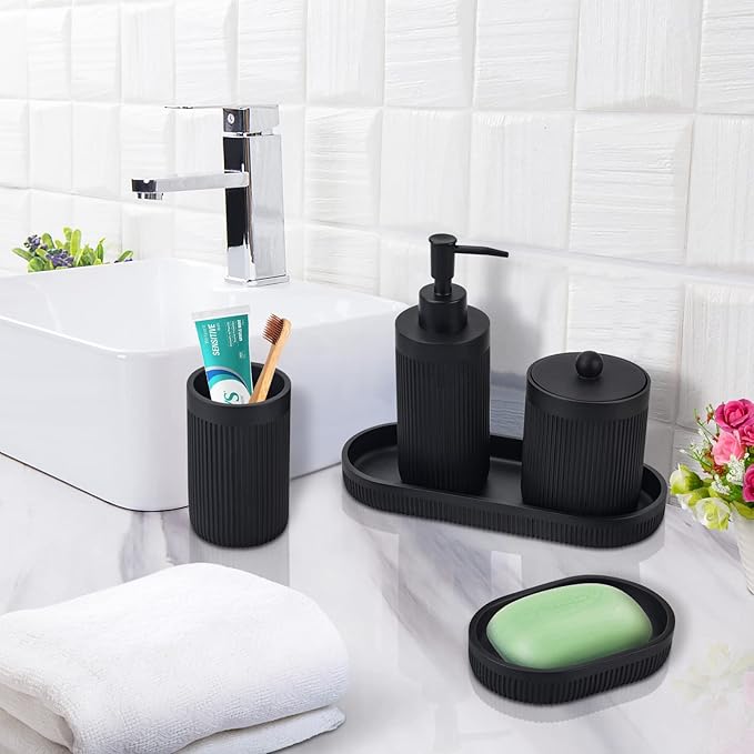 - đă5 Piece Complete Bathroom Accessory Setă:Includes 1 x soap dispenser,1 x toothbrush holder,1 x apothecary jar with lid,1 x vanity tray and 1 x soap dish,this elegant bathroom set keep your bathroom organized neatly.