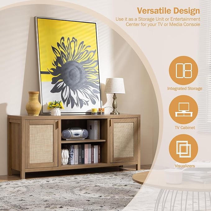 SICOTAS TV Stands for Living Room : Rattan TV Console Cabinet with Storage and Shelf, Boho Entertainment Center, 59" Media Console for 55, 65 Inch TV, 26" Tall Television Stands, Oak