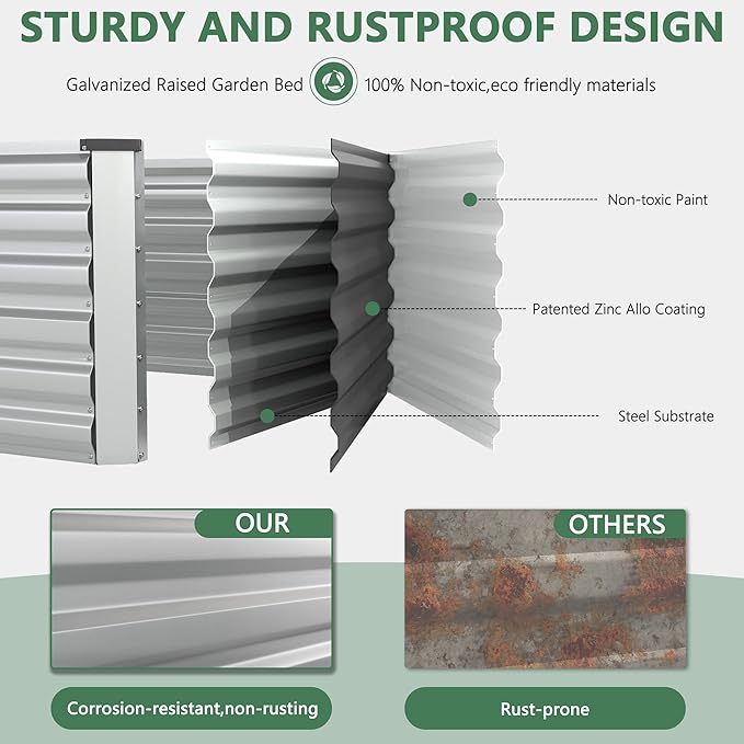 - 【Safety & Eco-Friendliness】The corners of the garden bed are rounded to prevent injury from sharp edges, ensuring user safety. The coating material is non-toxic and environmentally friendly, preventing the leaching of harmful substances into the soil and maintaining a clean and healthy growing environment for plants and vegetables.