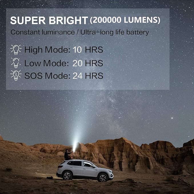 - Rechargeable spotlight with serious lasting power - UP TO 20 HOURS. Stop searching for batteries that are never there when you need them. This spotlight is made with 3 bulit-in ,long-lasting, rechargeable batteries with serious storage power (10000 mAh). A full charge is made to last longer than virtually any other flashlight - from 10 hours at 800 lumens to a whopping 20 hours at 400 lumens. Universal USB C charing port makes it easy to recharge in both car and home .