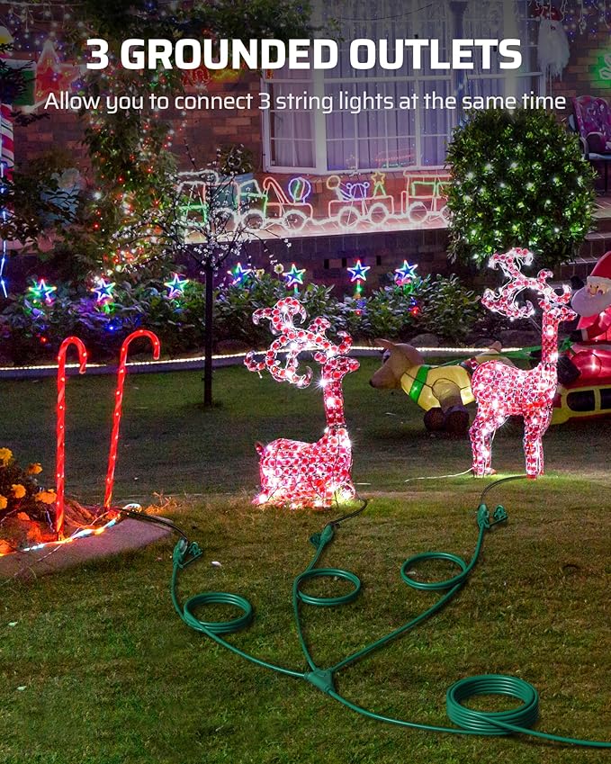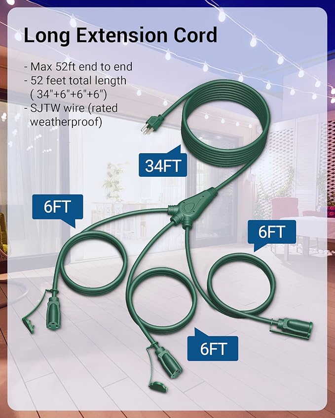 - [Total 52FT Extension Cord] Total 52ft (34'+6'+6'+6') devided into four parts, which the main power supply is 34ft from the plug to the 3 splitters and each branch is 6ft from the connector; outdoor triple extension cord minimizes the number of extension cords required, making landscape lighting and Christmas decorating a breeze