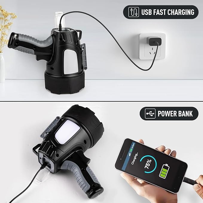 - 【USB Fasting Charging】The advantage of rechargeable spot light’s USB is that the charging speed is faster, the charging port is not easy to wear, and more enduring. This led spotlight flashlight with USB direct charging through a power bank, smartphone adapter, computer(laptop), car, or charging plug without disassembling the light. What's more surprising is that the high-powered spotlight has an output function, which can output power to your phone.