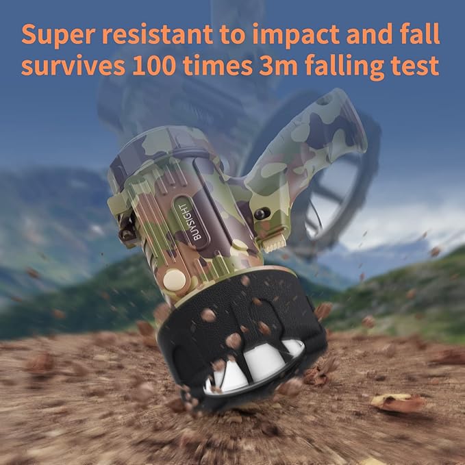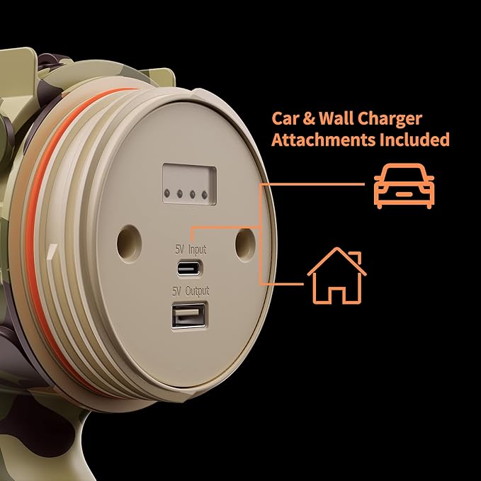 - 💪Upgraded larger size& lighter weigh design, more in line with the use of American habits, ergonomic design allows you to hold a long time not tired . Overpowering camouflage colored shell takes more colors to our hiking trip. Adjustable bracket equipped makes it a work light anytime, anywhere to free your hands. It’s also a large capacity power bank when you need.
