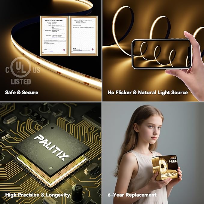 - Widely Use: These COB LED strip lights can be used to replace traditional SMD LED strip lights, providing higher brightness lighting! PAUTIX 2700K warm white COB LED strip light is ideal for high-end business clubs, under cabinets, vanity mirrors, dressing tables, closets, bunk bed lights, bookshelves, wine racks, stairs, TV backlights and other places where dry/clean/smooth is required DIY lighting decoration.
