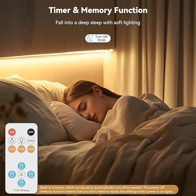 - Dimmable & Multifunctional: The RF remote control with 10 dimming levels allows you to easily dim the strip light! 3 preset brightness levels (25%, 50%, 100%) can help you quickly set the brightness of the strip light. 4 timing functions (60s, 10m, 30m, 60m) can make the strip light to turn off at the set time. It even has a memory function. When the strip light is turned off and on again, the previous settings will be restored and continue, no need to repeat the settings!