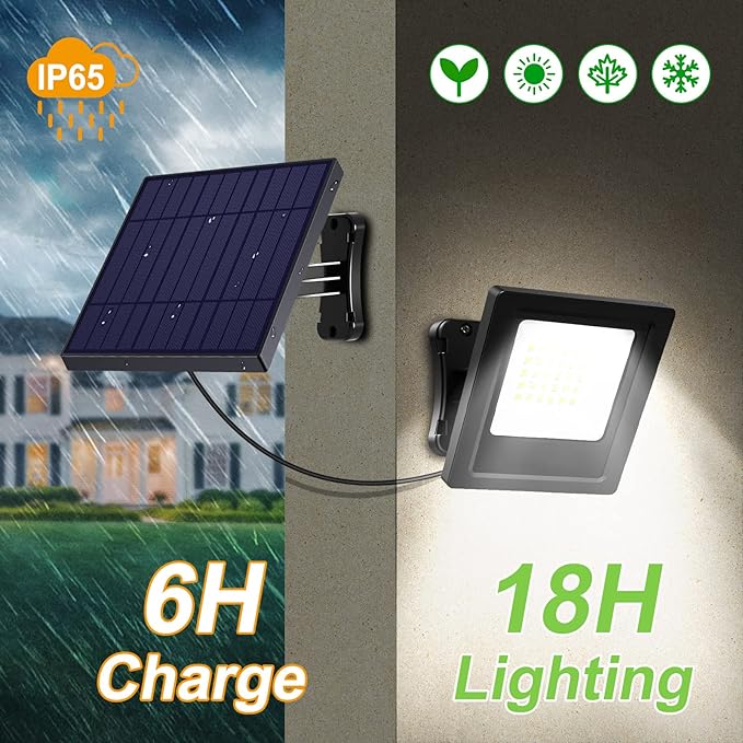 - 【Easy Installation】 - There is a 16.4ft connection wire between the solar panel and the solar flood light, with the solar panel installed in an area with sunlight, and the light installed wherever you need it. Make sure the lamp and solar panel are installed securely and, in a position to maximize exposure to sunlight during the day whilst avoiding artificial light sources at night. Insufficient charging will seriously affect the brightness and lighting durations.